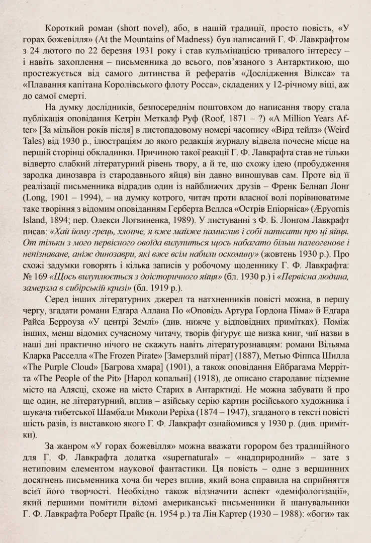 Примітки перекладача Богдана Стасюка до перекладу твору Г.Ф. Лавкрафта «У горах божевілля» від видавництва Varvar Publishing ілюстрованого Франсуа Баранже
